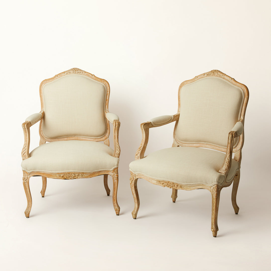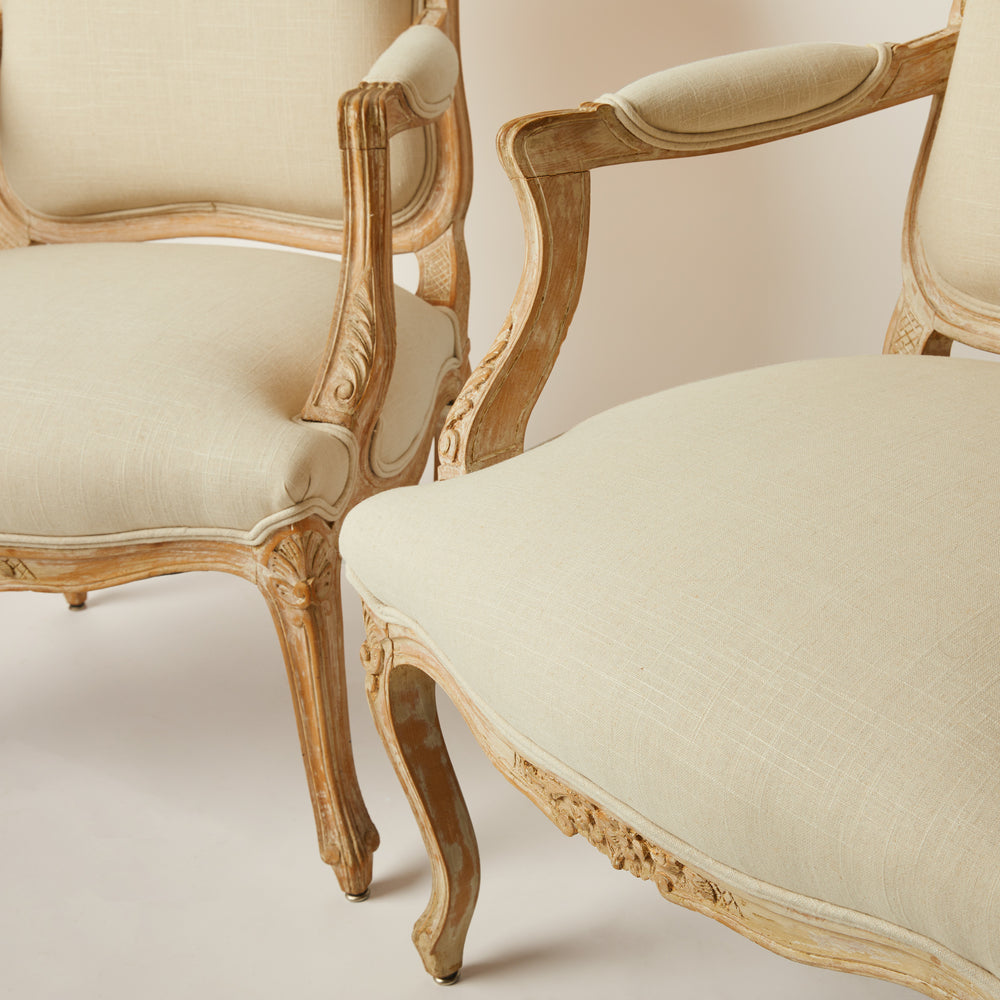 Pair of French Fauteuil Chairs Newly Upholstered In Linen