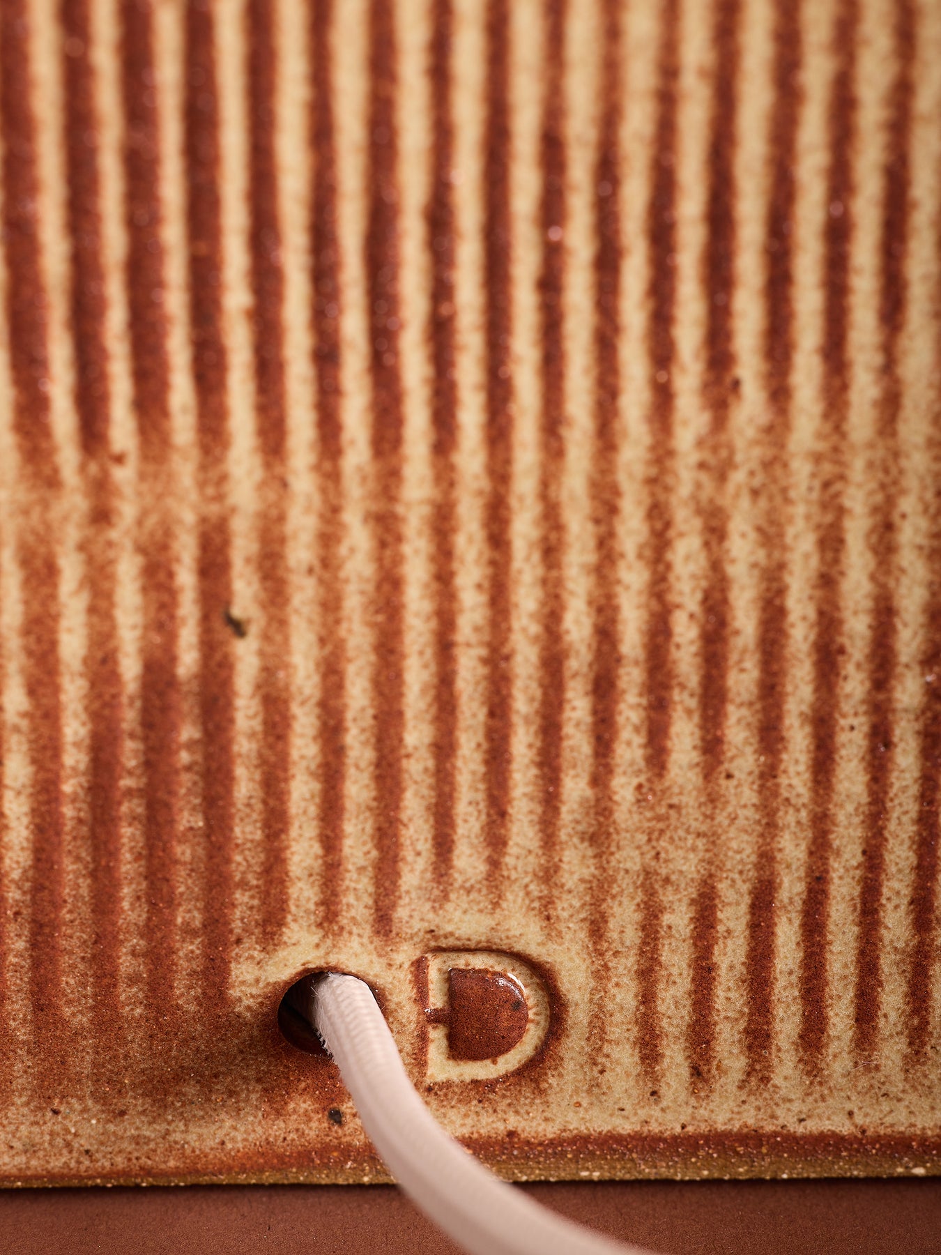 Dumais stoneware Caja Alta Table Lamp #2 is handcrafted using slab-construction techniques. The lamp’s pattern is created by rolling the surface with textured rolling pins and rods. The lamp’s sgraffiato pattern is created by scoring the surface with a wire-loop tool.