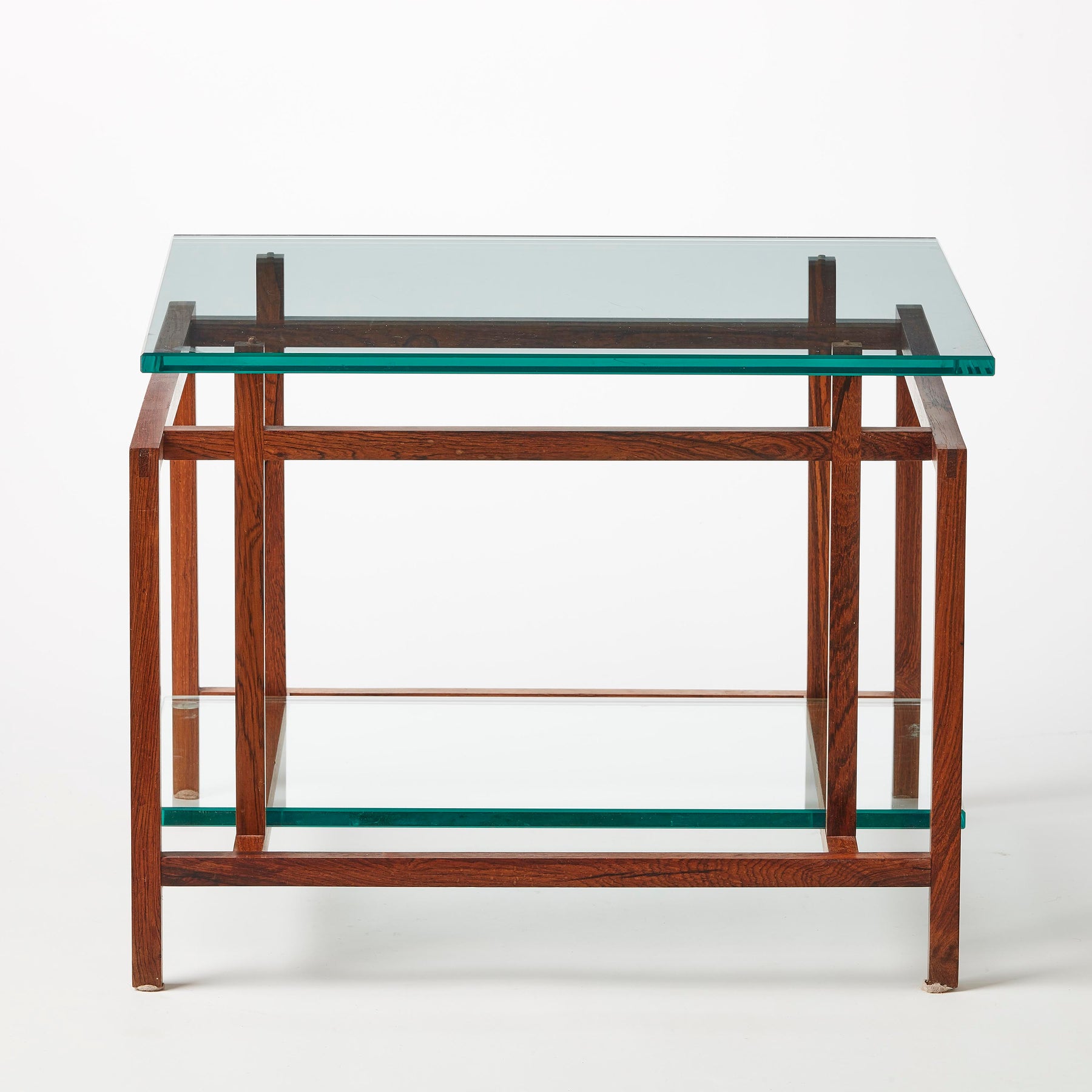 Architectural late 60's - early 70's teak side or end tables with glass tops by Henning Nørgaard for Komfort. Minimalist geometric solid teak base displays excellent craftsmanship, with both mortise-and-Tenon and finger joinery