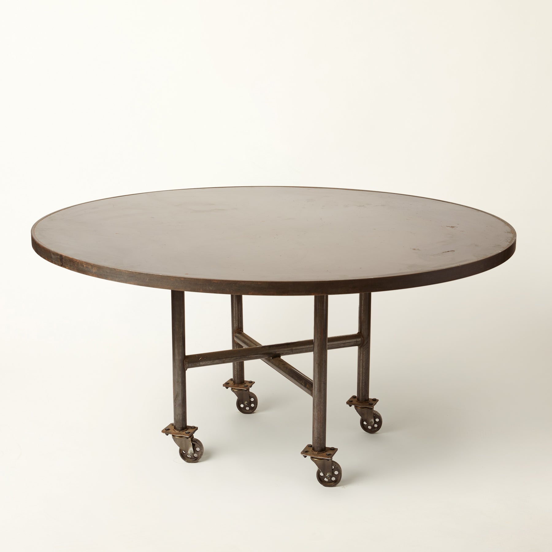 Vintage industrial round metal rolling table featuring a solid steel top, welded tubular frame, and original casters
